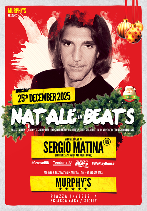 Natale In Beats @ Murphy’s 2025-12-25 22:00 Sciacca (AG) Murphy's Google Map Natale In Beats @ Murphy's!!! MURPHY’S PRESENTS THURSDAY DECEMBER 25TH, 2025 NATALE IN BEATS SPECIAL GUEST DJ: SERGIO MATINA (www.sergiomatina.com) Special D*Muzik 5 Hours DJ Session INFO PARTY: DOORS OPEN @ 10:00 PM MEGA SOUND & LIGHT SYSTEM SPECIAL SECURITY PHOTO & VIDEO SERVICE AND MANY MORE… DRESS CODE: GROOVY & TRENDY STYLE AMA LA MUSICA… DIVERTITI RESPONSABILMENTE!!! PLEASE DRINK RESPONSIBLY!!! FOLLOW US ON: WWW.FACEBOOK.COM/TENDENZIA FOR MORE INFO: WWW.TENDENZIA.NET | INFO@TENDENZIA.NET OFFICIAL PARTNERS: #GROOVEINN | TENDENZIA | JUICY BEATS MAGAZINE | WE PLAY HOUSE @ MURPHY’S PIAZZA INVEGES, 4 | SCIACCA (AG) | ITALY